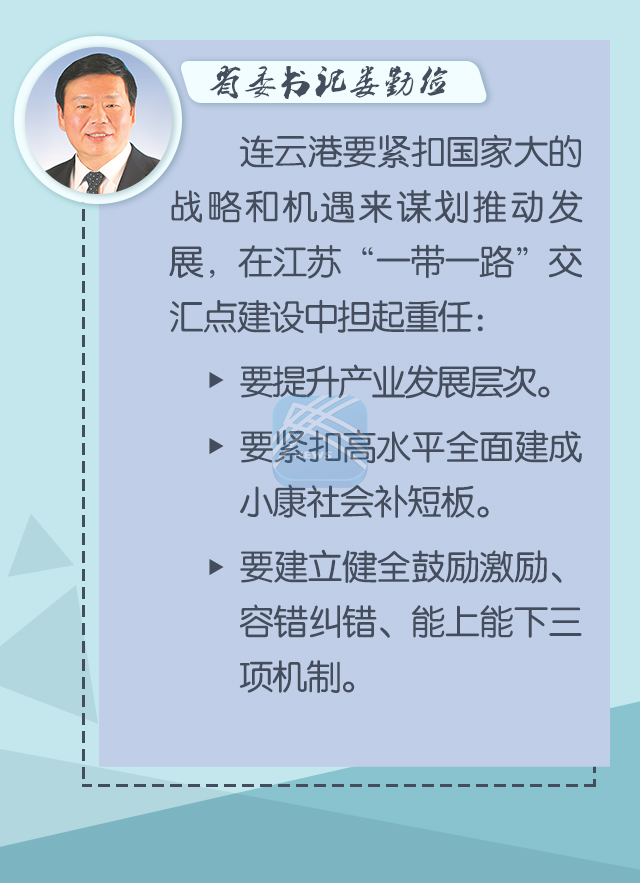 婁勤儉在聽取連云港工作匯報后說,連云港作為全國第一批對外開放的沿海港口城市,區(qū)位條件獨特,戰(zhàn)略地位重要,發(fā)展?jié)摿薮蟆A?xí)近平總書記對連云港發(fā)展非常關(guān)注,我們一定要牢記總書記的囑托,以習(xí)近平新時代中國特色社會主義思想為指導(dǎo),緊密結(jié)合實際貫徹好總書記一系列重要指示精神,認(rèn)真落實好省委十三屆三次全會部署,奮力推進(jìn)高質(zhì)量發(fā)展,特別是在“一帶一路”建設(shè)中發(fā)揮好連云港的支撐作用。