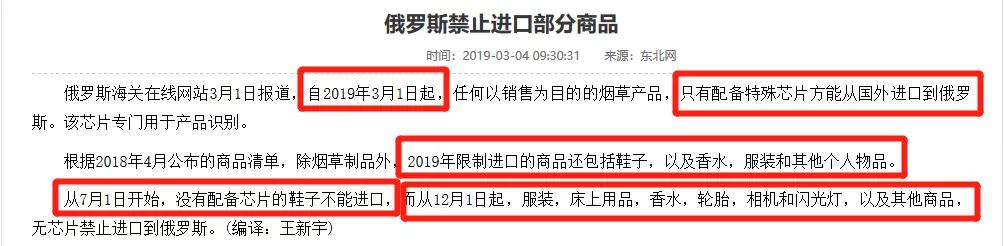 從7月1日開始,沒有配備芯片的鞋子不能進口,而從12月1日起,服裝,床上用品,香水,輪胎,相機和閃光燈,以及其他商品,無芯片禁止進口到俄羅斯。